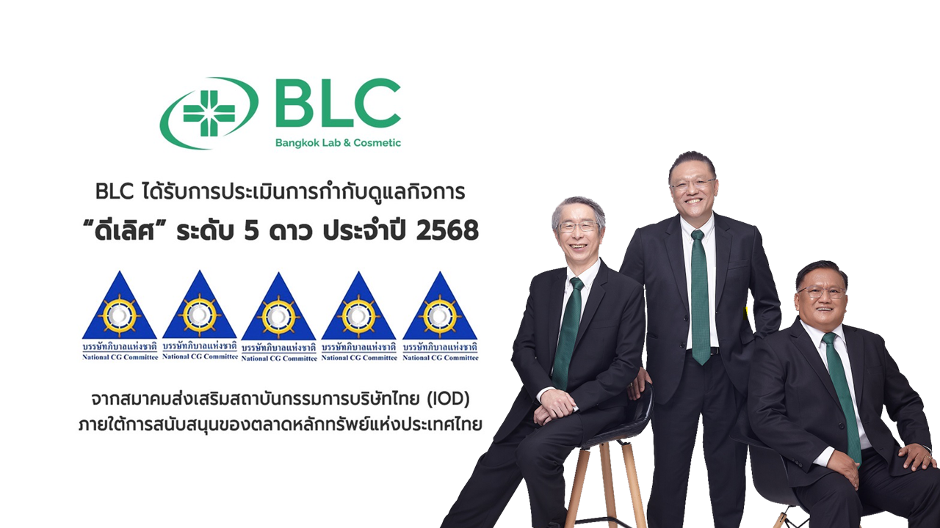 บริษัท บางกอกแล็ป แอนด์ คอสเมติค จำกัด(มหาชน) หรือ BLC คว้าผลประเมินการกำกับดูแลกิจการบริษัทจดทะเบียน CGR ในระดับ "ดีเลิศ" หรือ 5 ดาว (คะแนนรวม 90 คะแนน)![]()